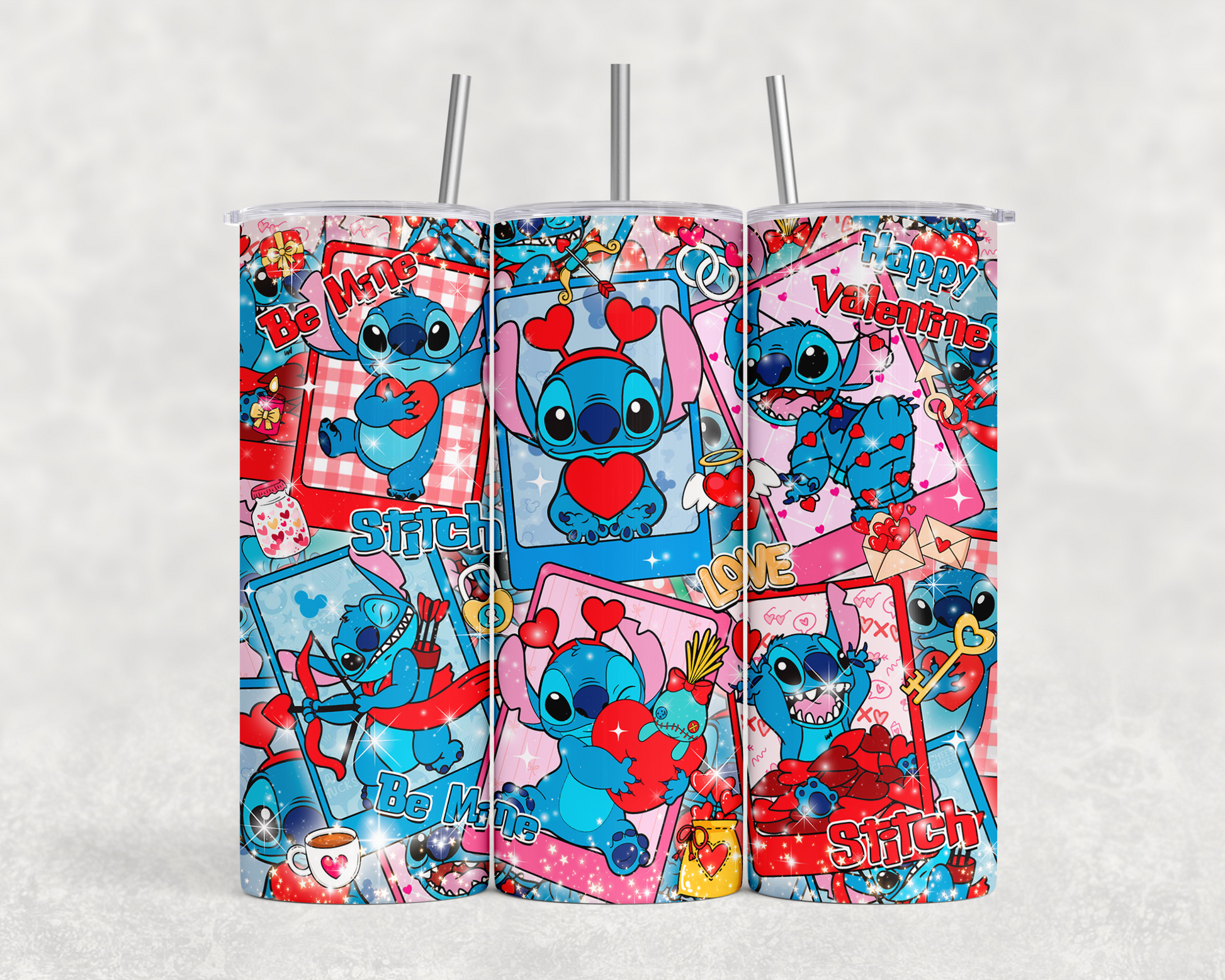 Celebrate Valentine's Day with everyone's favorite mischievous alien! This vibrant 20 oz tumbler features an energetic collage of Stitch in adorable Valentine's poses—holding hearts, sending love letters, and spreading joy with messages like "Be Mine," "Happy Valentine," and "LOVE." The playful design bursts with pink, red, and blue colors that capture Stitch's lovable personality.